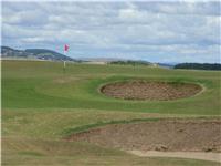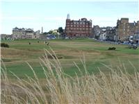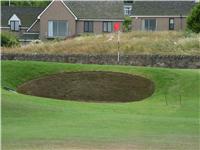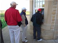 Und mit dem Gang auf das Tee die Entscheidung - den Driver über das Old Course Hotel oder "feige" an der linken Seite vorbei. Aber erst kamen ja meine Mitspieler: mein "Oldie" schlug links am Hotel vorbei, Graham aus Neuseeland mit einem satten Drive über die Hotelecke und Marc aus den USA knallte seinen Drive mitten in den Löwen, dessen Bild auf dem Hotel aufgemalt ist. Aber ich bin ja kein Angsthase und wollte auch etwas zu erzählen haben - also den Driver aus der Tasche und mit einem leichten Fade über die Hotelecke auf das Fairway. Mit einem Eisen (etwas zu weit links) vorgelegt und dann kam das nächste Problem - ein Pitch über den Road-Hole-Bunker auf die Mitte-Grün gesteckte Fahne. Also 60-Grad-Wedge raus, mutig durchgeschwungen - der Ball stieg über den Bunker, kam knapp hinter der Bunkerkante auf und rollte, rollte, rollte - und blieb soeben noch auf dem Grün liegen. Dann noch zwei Putts und das Bogey war sicher. Marc hatte übrigens nach dem verzogenen Abschlag ins Aus auch noch die Ehre in den Road-Hole-Bunker zu spielen: den ersten Schlag zur Fahne nicht heraus bekommen, den zweiten nach hinten auch nicht, den dritten zur Seite dann endlich heraus. Im Fernsehen sieht dieser Bunker (wie auch die anderen) immer so "easy" aus, aber es ist je nach Lage nahezu unmöglich frontal auf das Grün heraus zu spielen (zumindest für Amateure).